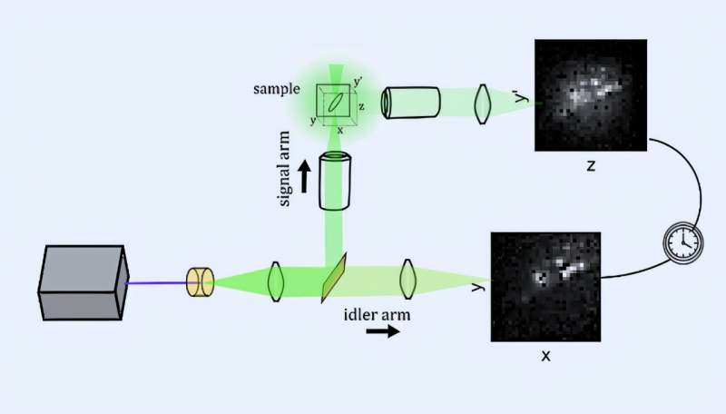 Lawrence Livermore Milli Laboratoriyası tərəfindən Gaby Clark tərəfindən redaktə edilmişdir , Andrew Zinin tərəfindən nəzərdən keçirilmişdir  Redaktorların qeydləri3D kvant kabus görüntüləmə mikroskopunun qurulması. Bir lazer və kristal (solda) parçalanan və iki istiqamətə göndərilən dolaşıq fotonları hazırlamaq üçün istifadə olunur. Bir nümunəni vurmaq və səpmək üçün sola dönür, 90 dərəcə bucaq altında standart bir görüntü təmin edir. Digəri düz davam […]