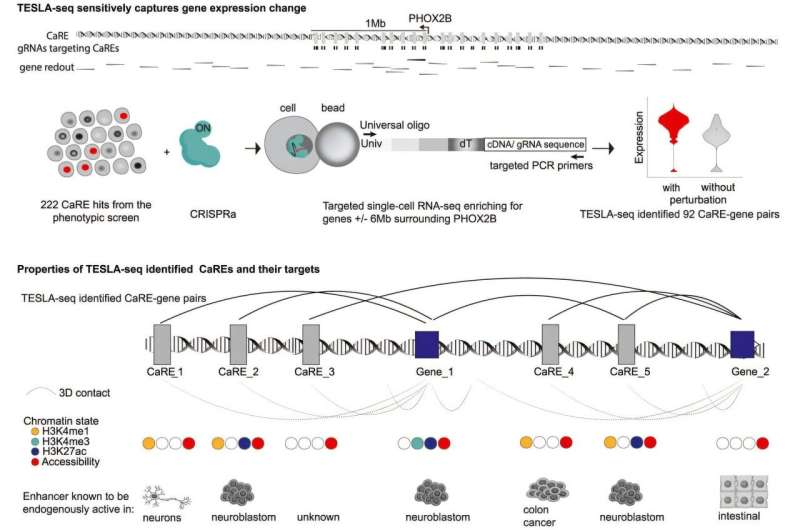 Komanda daha sonra təxminən 200 Care-ni daha ətraflı şəkildə böyüdüb və hər bir hüceyrənin daxilindəki gRNT və yaxınlıqdakı genlərdən ifadə olunan RNT-ni oxumaq üçün hədəflənmiş tək hüceyrəli RNT ardıcıllığından istifadə edib. Bu, onlara hər bir Qulluğu PHOX2B bölgəsindəki 70-dən çox gendən hər hansı biri ilə əlaqələndirməyə imkan verdi, onların ifadəsi həmin hüceyrədə dəyişdi. Onlar həmçinin xərçəng və Alzheimer xəstəliyində iştirak edən SHISA3 və APBB2-nin mühüm tənzimləyiciləri olan Care-lər arasında birbaşa əlaqə tapdılar.