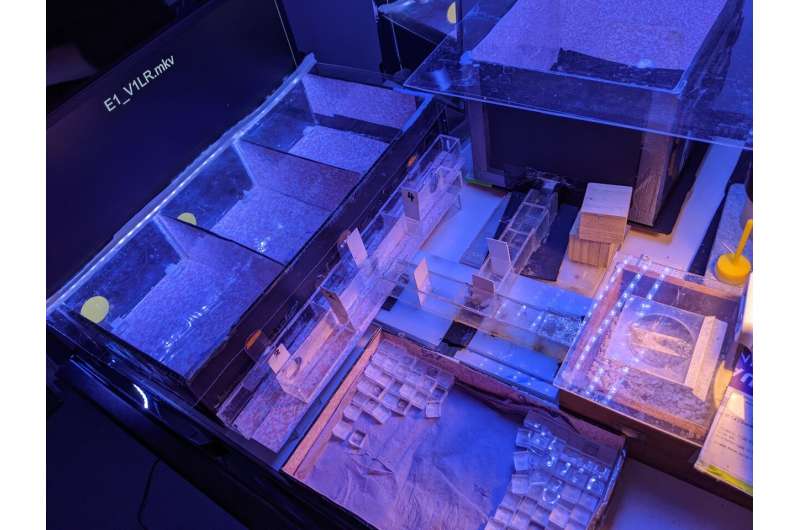 Labirintdəki hər otaqda nöqtə və tire stimulunun mövqeyi dəyişdirildi ki, arılar öz seçimlərini istiqamətləndirmək üçün məkan işarələrinə etibar edə bilməsinlər. Arılar şəkərlə qoşalaşmış yanıb-sönən dairəyə birbaşa getməyi öyrəndikdən sonra, arıların seçimlərinin şəkərdə mövcud olan qoxu və ya vizual siqnallarla deyil, yanıb-sönən işıqla idarə olunduğunu yoxlamaq üçün sayrışan işıqlarla sınaqdan keçirildi, lakin şəkər yoxdur.Eksperimental aparatın 3D modeli. Bir arı eksperimental sınaq keçirir. Yuva qutusundan onun marşrutu çıxarıla bilən plastik qapılar vasitəsilə qırmızı rənglə göstərilir. Birinci eksperimental bölmədə stimullar monitorda göstərilir və plastik çiplər əlaqəli məhlulu (təlim zamanı şəkər və ya acı xinin və sınaq zamanı su) saxlayır. Çiplərdən birindən qidalanma üçün ilk cəhd stimul seçimi kimi qeyd olunur. Arı növbəti sınaqlar üçün növbəti iki bölməyə davam edəcək ki, hər bir yem axtarışı üç sınaqdan ibarətdir. Kredit: Alex Davidson, Queen Mary University of London