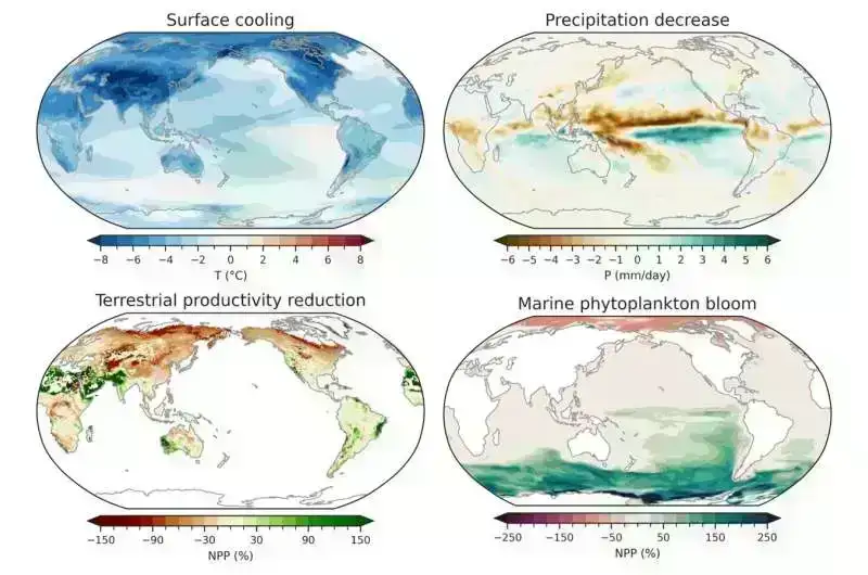 Ən intensiv ssenari üçün toz səbəbindən günəşin qaralması qlobal səthin 4˚C-ə qədər soyumasına, qlobal orta yağıntının 15% azalmasına və ozon təbəqəsinin təxminən 32% azalmasına səbəb olacaq. Bununla belə, regional miqyasda bu təsirlər daha qabarıq ola bilər.