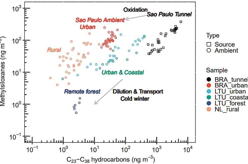 Tunel və atmosfer hissəciklərində metilsiloksanların C 23 –C 38 karbohidrogenlərinə qarşı səpələnmə qrafiki. Tunel hissəcikləri Braziliyanın San-Paulu şəhərində (BRA) toplanmışdır, ətraf mühit nümunələrinə isə Litvanın San-Paulu şəhərində (LTU) və Niderlandda (NL) toplanmış atmosfer hissəcikləri daxildir.