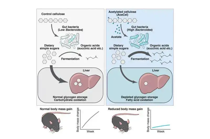 Daha çox məlumat: Tadashi Takeuchi et al, Asetilləşdirilmiş selüloz, ev sahibi üçün əlçatan karbohidratları istehlak edən bağırsaq kommensalları vasitəsilə bədən kütləsinin artımını boğur, Hüceyrə Metabolizmi (2025). DOI: 10.1016/j.cmet.2025.04.013