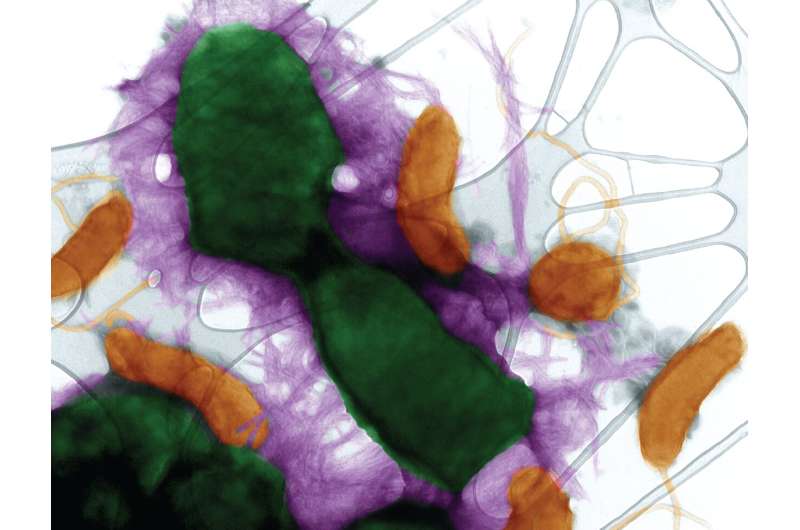 Redaktorların qeydləriFunksional amiloid qıvrımının (bənövşəyi) E. coli (yaşıl) yırtıcı Bdellovibrio bakteriovorus (narıncı) bakteriyasına qarşı müdafiə etmək üçün molekulyar zireh kimi necə fəaliyyət göstərdiyini nümayiş etdirən ötürücü elektron mikroqraf. Kredit: Whiteley Lab
