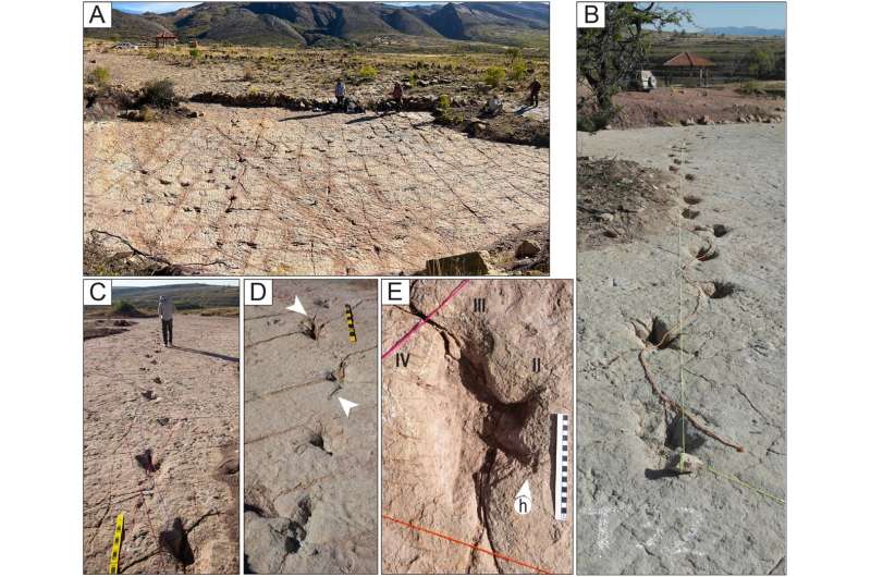 Redaktorların qeydləriA) CP3 sahəsində M5 qorunma üslubunun izləri olan yollar. Qatın səthindəki dalğalanmalara diqqət yetirin. B) Trackway T32 çox dərin izlərə və quyruq izlərinə malikdir. Sinuous kordon quyruq izlərini qeyd edir. C) T22-2-25 trassasının dərin izləri D) TS102 trassasının beş çox dərin izlərindən ibarət dəst. Ağ ox başlıqları quyruq izlərini göstərir. E) T22-126 trassasının L10 yolu. Rəqəmlər II, III və IV rəqəmləri ilə qeyd olunur. h = halluks. C və D-dəki tərəzi 10 sm-lik hissələrdə, E-də isə 20 sm-dir. Kredit: PLOS One (2025). DOI: 10.1371/journal.pone.0335973