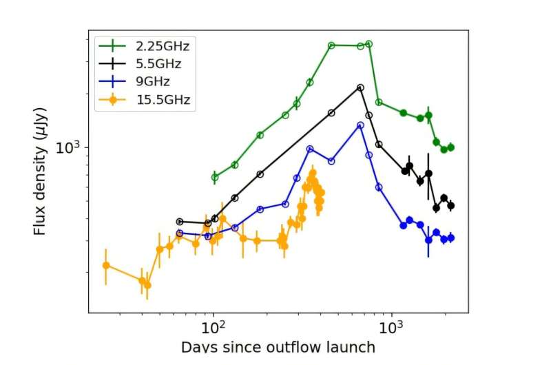 Tomasz Nowakowski , Phys.org Stefani Baum tərəfindən redaktə edilmiş , Robert Eqan tərəfindən nəzərdən keçirilmişdir Redaktorların qeydləriAT2019azh-ın 2.25, 5.5, 9 və 15.5 GHz işıq əyrisi.