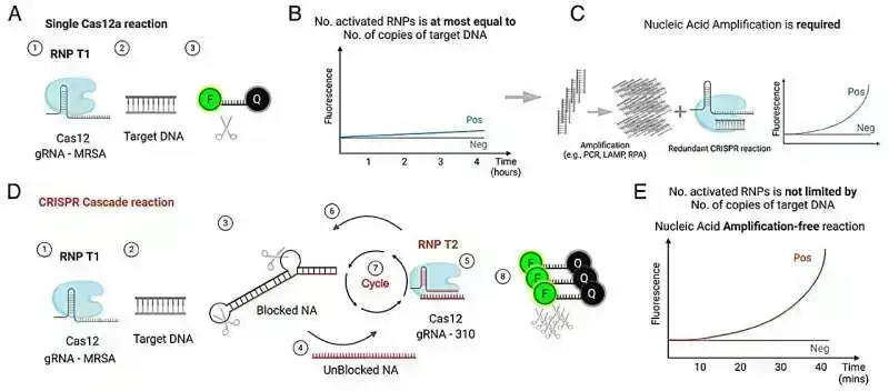Onların CRISPR-Cascade reaksiyası patogen DNT-nin gücləndirilmədən aşkarlanmasına nail olmaq üçün iki ribonukleoprotein kompleksindən, T1 və T2-dən istifadə edir. Hədəfin tanınmasından sonra, T1 kompleksindəki Cas12a bloklanmış nuklein turşularını parçalayır, T2 kompleksində daha çox Cas12a fermentini aktivləşdirən dəyişdirilə bilən qəfəsli RNT-nin buraxılmasına səbəb olur. Bu öz-özünə davam edən əks əlaqə halqası 10 dəqiqə ərzində attomolar həssaslıqda flüoresan əsaslı sürətli aşkarlamağa imkan verir.