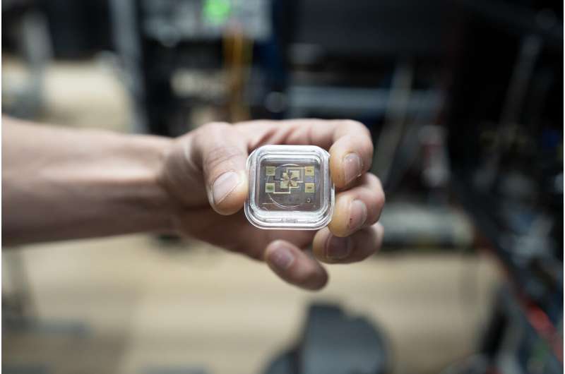 Redaktorların qeydləriNIST fiziki David Hume alüminium ion saatı üçün yeni dəyişdirilmiş ion tələsini saxlayır. Tələni dəyişdirərək, alüminium ionu və onun maqnezium ionu partnyoru narahat olmadan “gənə” edə bildi. Kredit: R. Jacobson/NIST