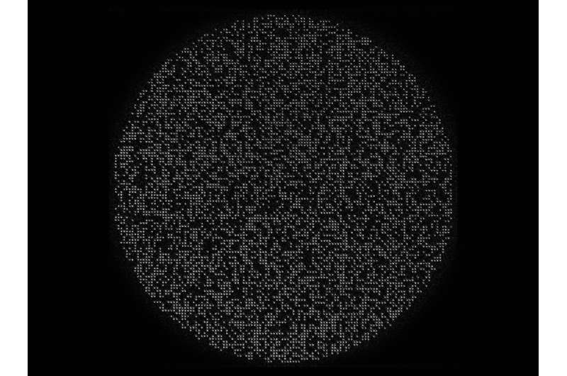 Redaktorların qeydləriBu şəkil optik maqqaş adlanan yüksək fokuslanmış lazer şüaları tərəfindən tutulan 6100 sezium atomunu göstərir. Dairənin eni təxminən bir millimetrdir. Kredit: Caltech/Endres Lab