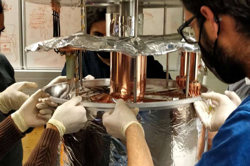 Redaktorların qeydləriTədqiqatçılar yarımkeçirici çipdə kvant nöqtələri ilə ultra aşağı temperaturlu təcrübələrə hazırlaşaraq, eksperimental fizika laboratoriyasında böyük kriostat yığırlar. Kredit: Universität Innsbruck