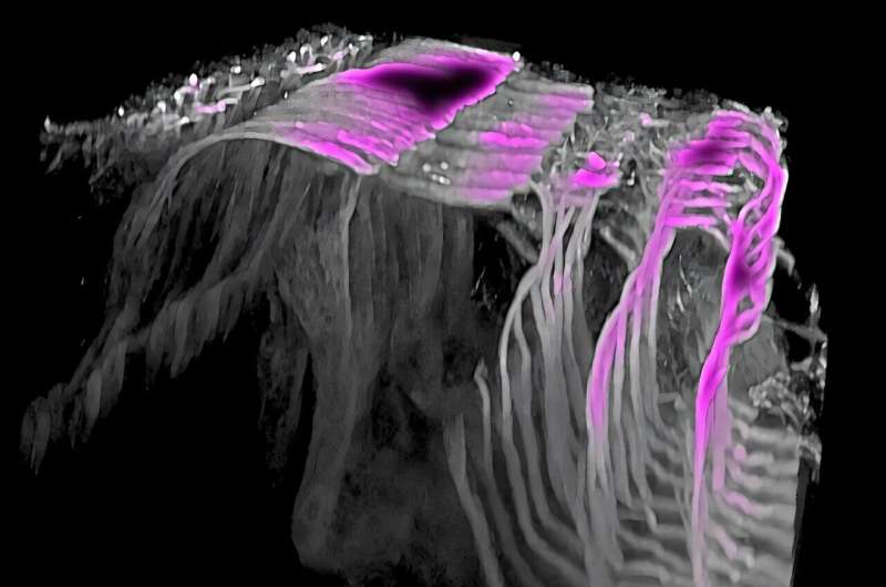 Redaktorların qeydləriSaç hüceyrələri ilə birləşən (göstərilmir) və şəxsiyyəti və dəqiq düzülüşü qismən daxili tük hüceyrələri tərəfindən diktə edilən müxtəlif növ dəstəkləyici hüceyrələrin sitoskeletonları. Kredit: García-Añoveros laboratoriyası.