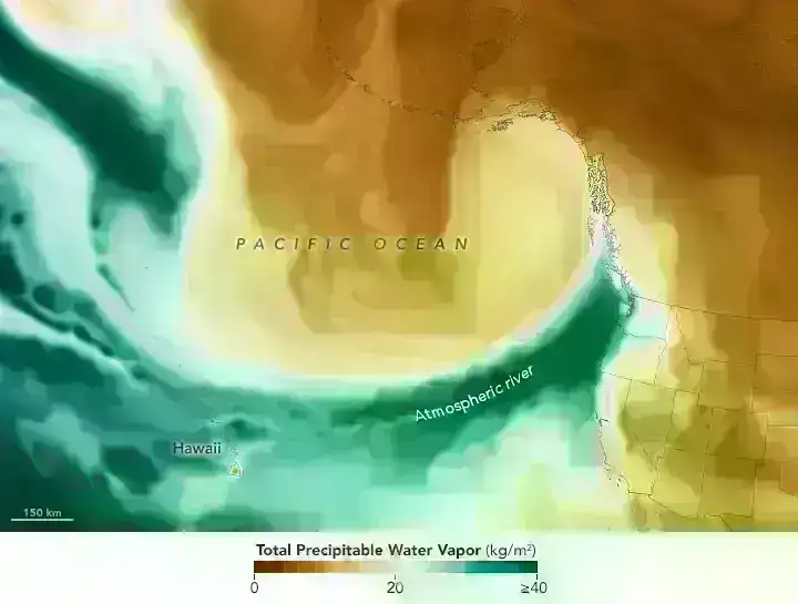 Bu xəritə dekabrın 4-də Sakit Okean vaxtı ilə saat 13:30-da atmosferdə çökə bilən su buxarının ümumi miqdarını göstərir. Çəkilən su buxarı, bütün su buxarı maye halına salınıbsa, atmosfer sütununda suyun miqdarıdır. Xəritədəki tünd yaşıl sahələr Sakit okeanın tropik hissəsindən şimal-şərqə axan nəmli hava zolağını vurğulayır. Şəkil atmosferdə baş verənləri hesablamaq üçün peyk məlumatlarından və fiziki proseslərin modellərindən istifadə edən NASA -nın GEOS ADAS-dan (Goddard Earth Observing System, Atmospheric Data Assimilation System) əldə edilib.