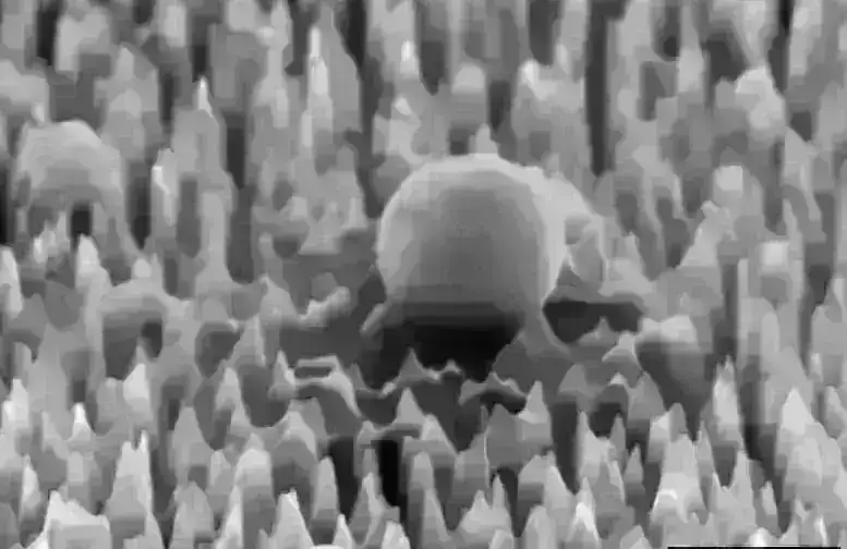 65.000 dəfə böyüdülmüş nano sünbüllü silikon səthində bir virus. 6 saatdan sonra tamamilə məhv edildi. Kredit: RMIT