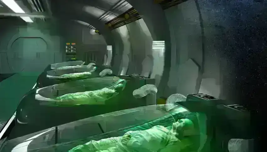 Bir yeniyetmə kosmik gəmiyə minən insanlar sırasına qoşulur. Gəmiyə mindikdən sonra çarpayıya yaxınlaşır, sürünərək içəri girir, qapağı bağlayır və yuxuya gedir. Onun bədəni Yerdən bir neçə işıq ili uzaqlıqda olan planetə səyahət üçün donub qalıb. Bir neçə il sonra oyanır, hələ eyni yaşdadır. Yuxuda olarkən həyatını dayandırmaq qabiliyyətinə “dayandırılmış animasiya” deyilir.