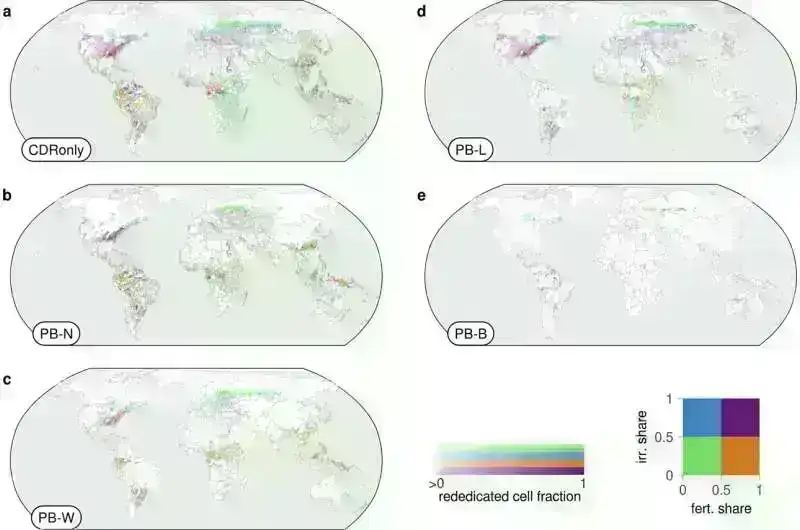 OynaAzot axını (N), şirin su dəyişikliyi (W), torpaq sisteminin dəyişməsi (L), biosfer bütövlüyü (B) və tam meşə mühafizəsi (FP) üçün (Yalnız CDRon) və planetar sərhəd (PB) məhdudiyyətlərinin tədricən əlavə edilməsi ilə xalis CDR-ni maksimuma çatdırmaq üçün biokütlə plantasiyalarının optimallaşdırılmış paylanması. PB məhdudiyyətləri altında plantasiyanın genişləndirilməsi və/yaxud idarə olunması müvafiq PB hədləri ilə məhdudlaşdırılır; əkinçilik əraziləri ərzaq, yem və lif istehsalı üçün qorunur və bataqlıqlar, şəhər əraziləri və qorunan ərazilər çevrilmədən çıxarılır. Kredit: Communications Earth & Environment (2025). DOI: 10.1038/s43247-025-02033-6