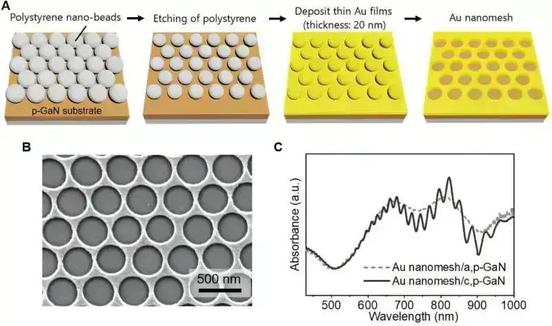 Au nanomesh hazırlamaq üçün polistirol nano-muncuq monolayer məclisi əvvəlcə qallium nitridi (p-GaN) substratına yerləşdirildi və sonra polistirol nano-muncuqları nanomesh şablonu yaratmaq üçün həkk olundu. Sonra, 20 nm qalınlığında qızıl nano-film çökdürüldü və GaN substratında qızıl nano-mesh quruluşunu həyata keçirmək üçün həkk olunmuş polistirol nano-muncuqlar çıxarıldı. Hazırlanmış Au nanomesh plazmonik rezonans effektinə görə görünən diapazonda güclü işığın udulması nümayiş etdirdi.