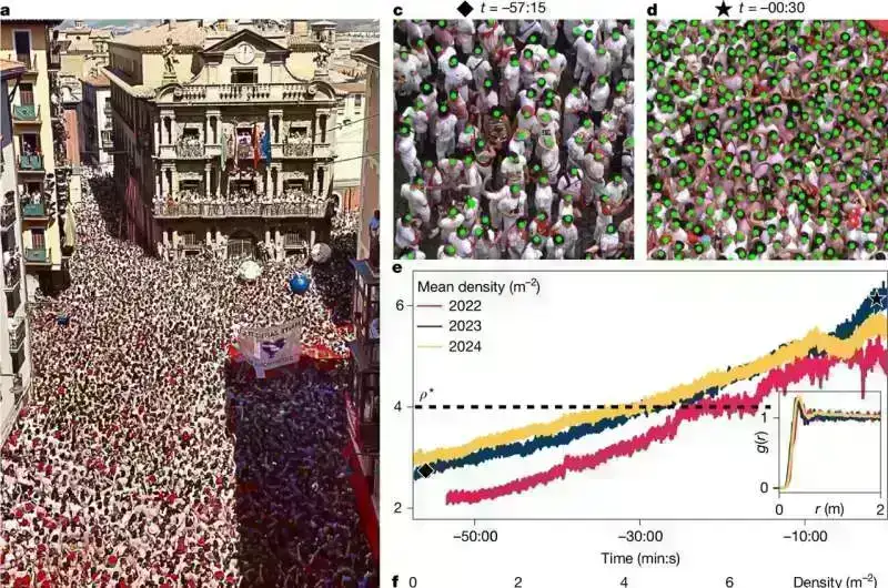 Denis Bartolo və həmkarları , uzunluğu 50 metr və eni 20 metr olan meydanda iki müşahidə yerində yerləşdirilən kameralardan istifadə edərək, İspaniyanın Pamplona şəhərində San Fermin festivalının dörd nümunəsi üzərində təxminən 5000 nəfərin izdihamını izlədilər . Onların çəkilişləri və riyazi model vasitəsilə – insanların o qədər sıx olduğu və izdihamın bir maye kimi qəbul edilə biləcəyi bir yerdə – izdihamın sıxlığının festival başlamazdan bir saat əvvəl hər kvadrat metrə iki nəfərdən tədbir zamanı hər kvadrat metrə altı nəfərə qədər dəyişdiyini tapdılar.