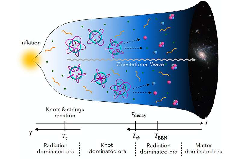 Redaktorların qeydləriModel, bu dolaşıq enerji sahələrinin hər şeydən üstün olduğu qısa “düyünlərin üstünlük təşkil etdiyi dövr”ü, qravitasiya dalğası siqnalları vasitəsilə yoxlanıla bilən bir ssenari təklif edir. Kredit: Muneto Nitta