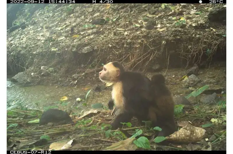 2022-ci ildə doktorantura tədqiqatçısı Zoë Qoldsboro kamera tələsinin görüntülərini nəzərdən keçirərkən qeyri-adi bir mənzərə tapdı, əvvəlki beş ildə heç vaxt görmədikləri bir şey: kürəyində ulayan körpə meymunu daşıyan kapuçin meymunu .