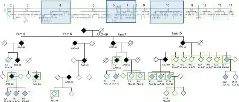 PSEN2 p.Asn141Ile mutasiyasını daşıyan böyük ailənin üzvü olan iştirakçı, gözlənilən xəstəliyin başlanğıc yaşından çox asimptomatik olaraq qaldı. Ailə tarixinin təhlili göstərdi ki, iştirakçının 13 ana xalası və dayısından 11-i 50 yaşa qədər AD inkişaf etdirdi. Ailəyə məxsus məlumatlara əsasən, bu mutasiya üçün orta simptomatik yaş 53,7 ildir, lakin bu fərd 71 yaşında koqnitiv olaraq normal olaraq qalır.