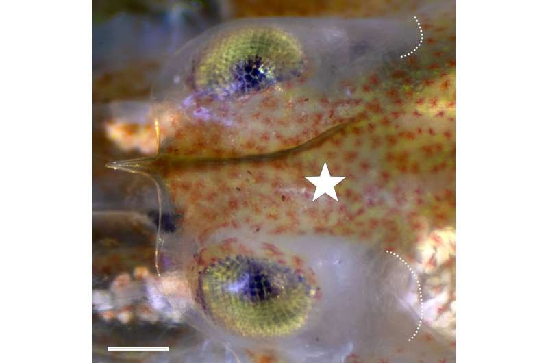 A. heterochaelis-in orbital qapağı gözləri və başı örtən şəffaf, dəbilqəyəbənzər bir quruluşdur. Orbital qapağının arxa kənarı gözlərin arxasındakı karapasla (nöqtəli xətlər) birləşir. Beyin (ulduz) ventraldır və gözlərdən bir qədər arxadadır. Miqyas zolağı = 500 μm. Mənbə: Journal of the Royal Society Interface (2026). DOI: 10.1098/rsif.2025.0769