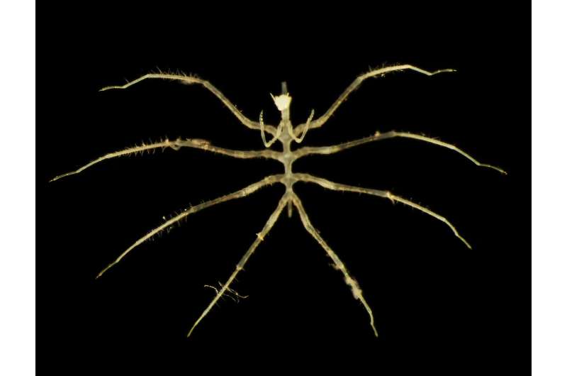 Redaktorların qeydləriDəniz hörümçək. Bu, quru hörümçəkləri ilə əlaqəli olan, lakin bu qrupa aid olmayan bir heyvan növüdür. Onlar Antarktida ətrafındakı dərin dənizdə xurma ölçüsünə qədər böyüyə bilər, lakin bu xüsusi növün ölçüsü cəmi bir neçə millimetrdir. Kredit: Təbiət Tarixi Muzeyi, London və Göteborqs universitet