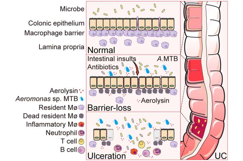 Redaktorların qeydləriAeromonas variantı, MTB, kolon makrofaqlarını pozaraq ülseratif kolitə (UC) həssaslığı artırır. Kredit: Elm (2025). DOI: 10.1126/science.adz4712