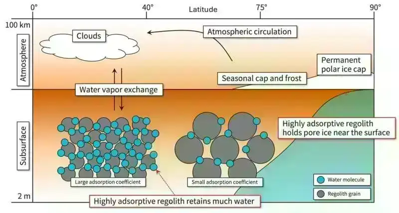 Model Marsın yeraltı suyun səthdən 2 metrə qədər paylanmasını təxmin etdi. Bir süngər kimi, Marsın orta və aşağı enliklərində yüksək udma qabiliyyətinə malik reqolit əhəmiyyətli miqdarda udulmuş suyu saxlayır. Bu suyun bir hissəsi, tapıntılar göstərdi ki, reqolitin səthində sabit adsorbsiya edilmiş su kimi qalır.