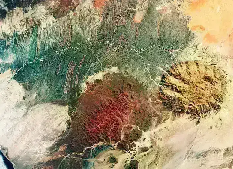 Bu saxta rəngli şəkil 2024-cü ilin aprelində çəkilib və Copernicus Sentinel-2-nin yaxın infraqırmızı kanalı bu son dərəcə quraq, səhra mənzərəsinin seyrək bitki örtüyünü vurğulamaq üçün istifadə edilib. Uqabın əsas yolu boyunca qırmızı bitki örtüyü görünür.