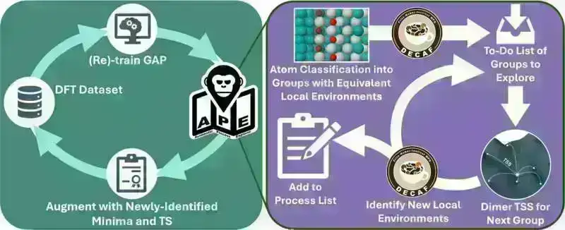 Fritz Haber İnstitutunun Nəzəriyyə Departamenti tərəfindən hazırlanmış APE, sistemin cari vəziyyətinə əsaslanan proseslərin siyahısını dinamik şəkildə yeniləyərək ənənəvi kMC simulyasiyalarında qərəzləri aradan qaldırır. Bu yanaşma yeni strukturların kəşfiyyatını təşviq edir, struktur kəşfiyyatında müxtəlifliyi və səmərəliliyi təşviq edir. APE fərqli atom mühitlərini müəyyən etmək üçün qeyri-səlis maşın öyrənmə təsnifatından istifadə edərək prosesin kəşfiyyatını kMC simulyasiyalarından ayırır. Bu, potensial atom hərəkətlərini daha geniş şəkildə araşdırmağa imkan verir.