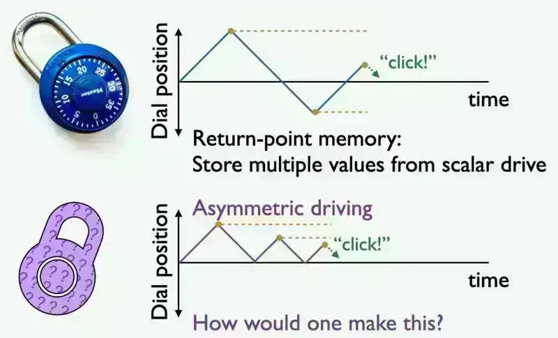Kilidlə, kadrı saat əqrəbi istiqamətində və saat əqrəbinin əksi istiqamətində müəyyən ardıcıllıqla fırlatmaq siferblatın necə köçürülməsindən asılı olan nəticəni – kilidin açılmasını verir. Eyni şəkildə, geri qayıtma nöqtəsi yaddaşı olan materiallar üçün müsbət və mənfi deformasiyalar arasında dəyişmək tədqiqatçıların oxuya və ya silə biləcəyi ardıcıllığın yaddaşını tərk edə bilər.