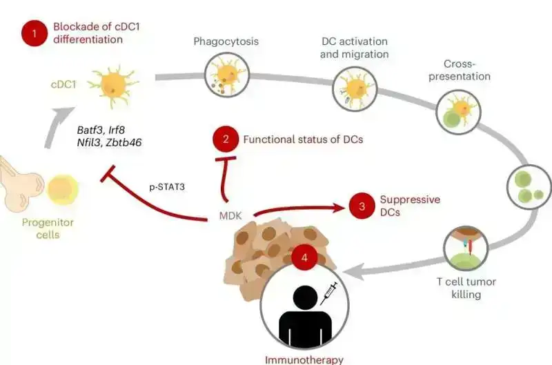 Bundan əlavə, Midkine dendritik hüceyrələri öz funksiyalarını dəyişdirmək üçün yenidən proqramlaşdırır ki, şiş inkişafını təşviq etsin.