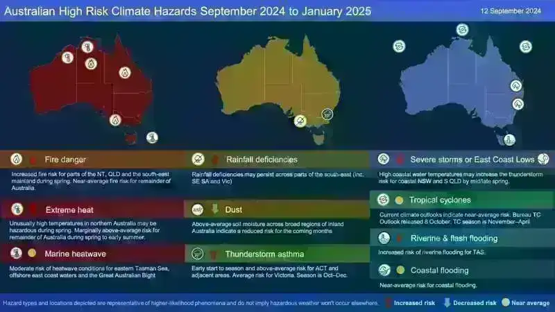 Daha isti şərait və proqnozda güclü yağış siqnalının olmaması ilə bu yaz Avstraliyanın şimal-şərqinin çox hissəsində, eləcə də Viktoriya və Cənubi Avstraliyanın cənub-şərqində quraqlıqdan təsirlənən ərazilərdə meşə yanğınları riski artır. Noyabr ayında yayda meşə yanğını proqnozu gələcək.