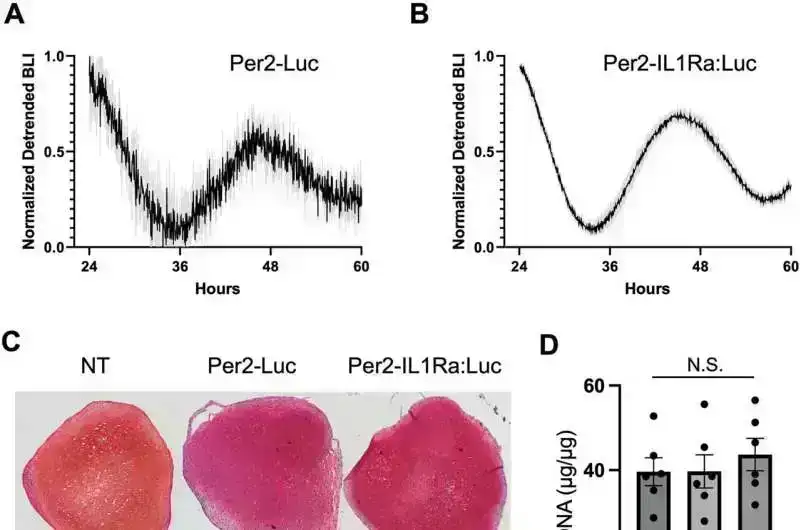 OynaPer2-Luc bioluminescence in vitro toxuma mühəndisliyi ilə hazırlanmış qığırdaq qranulundan 5 gün ərzində hər saat təsvir edilmişdir. Ölçək çubuğu = 200 µm. Kredit: Nature Communications (2025). DOI: 10.1038/s41467-025-56584-5