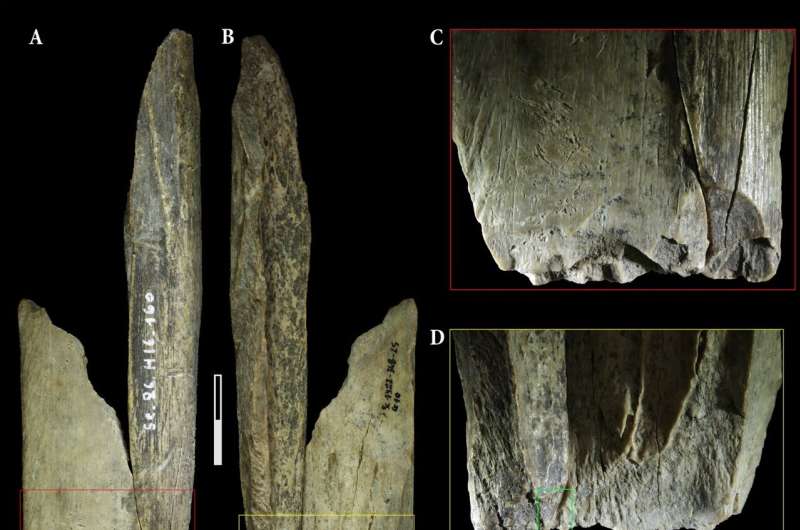 Scientific Reports -da dərc edilən sümüyün təfərrüatlı təhlili qəsdən formalaşdırma, istifadə və yenidən təyinat əlamətlərini aşkar etdi. Alətlərin əvvəlcə kəsmə kimi vəzifələr üçün istifadə edildiyi, daha sonra retuş kimi tanınan bir prosesdə çaxmaq daşı alətləri formalaşdırmaq və ya itiləmək üçün qırılaraq yenidən istifadə edildiyi düşünülür .