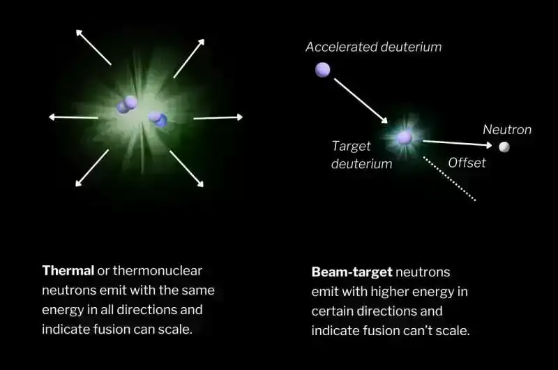 İstilik sintezi izotrop sürətlərə malik və ya bütün istiqamətlərdə eyni enerjiyə malik neytronları, şüa hədəfli birləşmə isə onları anizotrop şəkildə və ya müəyyən istiqamətlərdə olan neytronların daha yüksək enerjiyə malik olması üçün istehsal edir. Beləliklə, müxtəlif yerlərdə neytron enerjisinin ölçmələrini müqayisə etmək FuZE cihazındakı birləşmənin nə qədər istilik olmadığını görmək üçün sadə bir yoldur.
