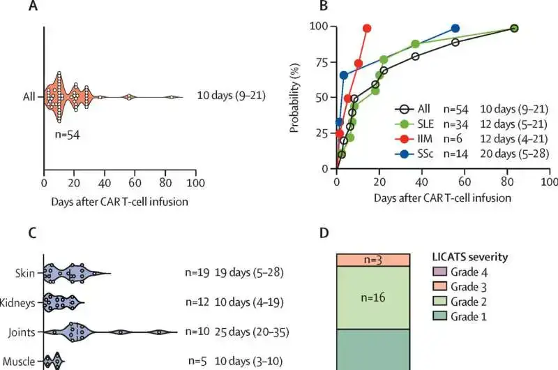Friedrich-Alexander-Universität Erlangen-Nürnberg-in tədqiqatçıları otoimmün xəstəlikdə CD19 hədəflənmiş CAR T-hüceyrə terapiyası ilə əlaqəli əvvəllər sənədləşdirilməmiş, orqan-spesifik toksikliyi müəyyən etdilər. Yerli immun effektor hüceyrəsi ilə əlaqəli toksiklik sindromu (LICATS) adlandırılan sindrom xəstələrin 77%-ni əhatə edib və uzunmüddətli ağırlaşmalar olmadan keçib.