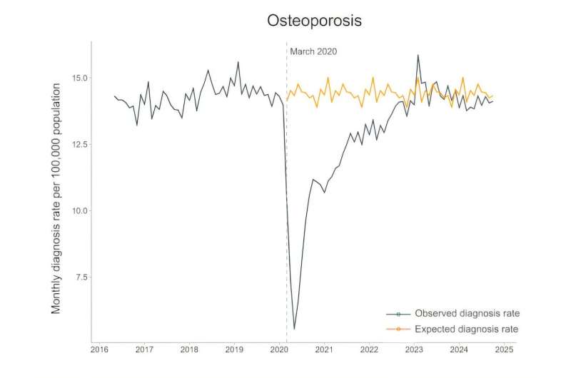 Pandemiyanın əvvəlində osteoporozun yeni diaqnozları üçdə bir azaldı və təxminən üç il ərzində gözlənilən səviyyəyə qayıtmadı. Nəticədə, 2020-ci ilin mart ayı ilə 2024-cü ilin noyabr ayı arasında İngiltərədə gözləniləndən 50.000-dən çox az insana osteoporoz diaqnozu qoyuldu.