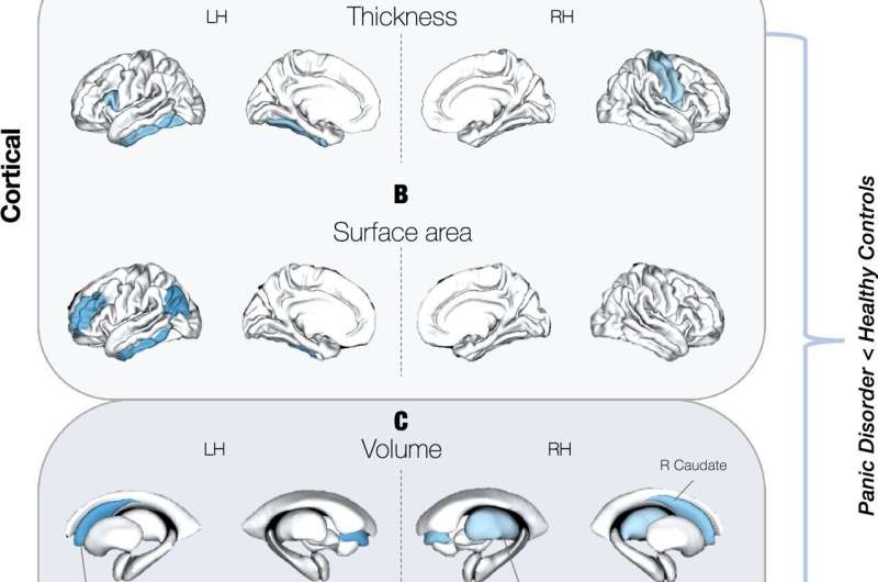 (A) Kortikal qalınlığın aşağı olması (B) Panik pozğunluğu olan şəxslərdə sağlam nəzarət qrupu ilə müqayisədə kortikal səth sahəsinin daha kiçik olması və (C) subkortikal həcmlərin daha kiçik olması. D Panik pozğunluğu erkən başlayan (≤21 yaş) şəxslərdə həm sol, həm də sağ yan mədəciklər xəstəliyin gec başladığı (>21 yaş) şəxslərlə müqayisədə daha böyük idi. Sol yarımkürə, Rh Sağ yarımkürə. Kredit: Molekulyar Psixiatriya (2026). DOI: 10.1038/s41380-025-03376-4