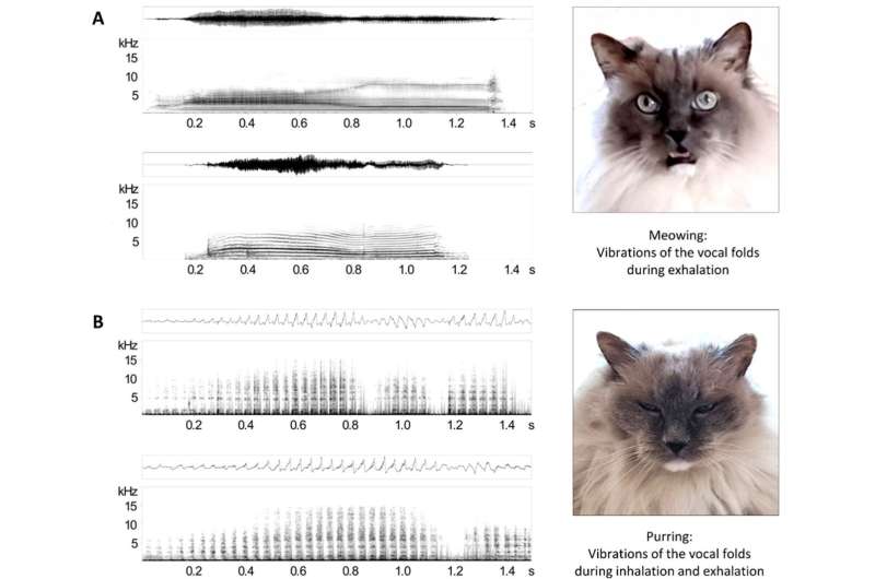 Redaktorların qeydləri(A) iki miyavlama və (B) iki mırıltının spektroqramları və ossiloqramları. Kredit: Elmi Hesabatlar (2025). DOI: 10.1038/s41598-025-31536-7
