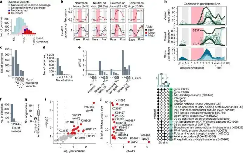 Tədqiqatçılar komensal bakteriya populyasiyalarını təmsil edən 5665 genomu yenidən qurdular və 2,3 milyon genetik variant müəyyən etdilər. Bunların arasında 513 populyasiya selektiv süpürmələr, adaptiv təkamülün aydın sübutu nümayiş etdirdi. Mutasiyaların yüksək konsentrasiyası ftorxinolon müqaviməti ilə əlaqəli olan gyrA-da baş verdi.
