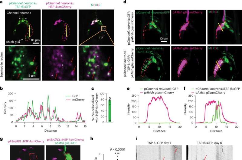 Redaktorların qeydləriNeyron istilik şoku zülalları (HSP) hüceyrədənkənar veziküllər (EV) vasitəsilə glial hüceyrələrə ötürülür. TSP-6::GFP, EV markeri, neyronlarda ifadə edilir. Kredit: Wu et al.