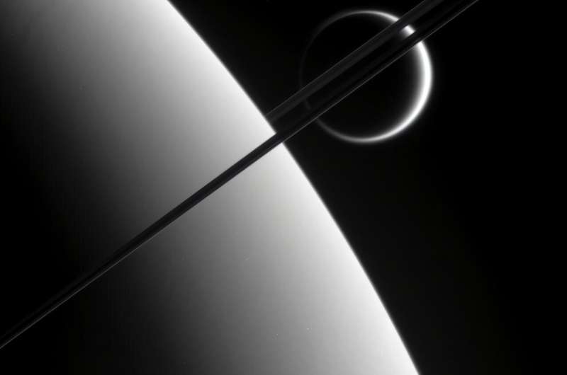 Kassini Saturnun arxasındakı uzaqdan Titanı seyr edir. Mənbə: NASA/JPL/Kosmik Elmlər İnstitutu