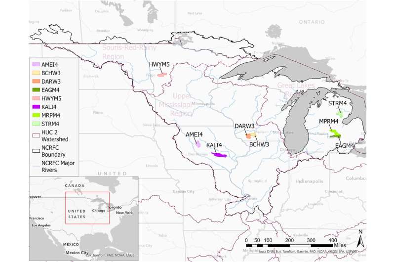 ABŞ-ın Yuxarı Orta Qərbindəki NCRFC ərazisindəki sınaq hövzələri, bu məqalədə istifadə olunan su hövzələrinin yerini göstərir. Mənbə: Su Resursları Tədqiqatı (2025). DOI: 10.1029/2024wr039064