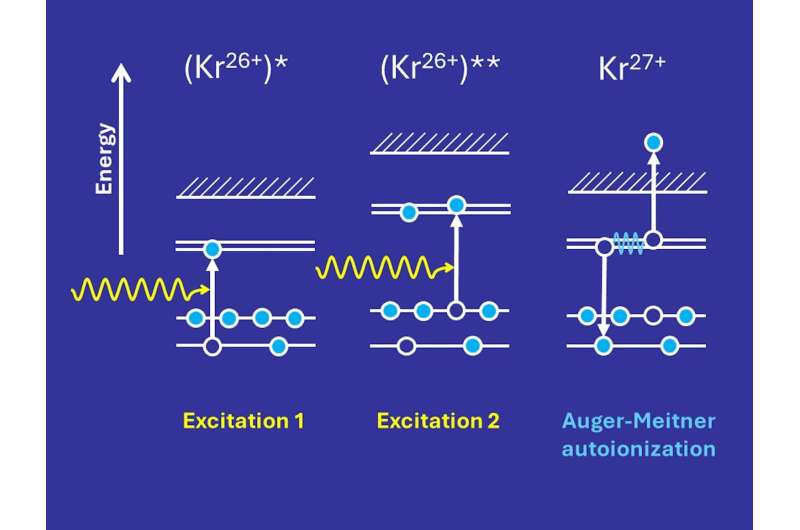 Redaktorların qeydləriYüksək yüklü kriptonun ultrasürətli ikiqat rezonans ionlaşması: İki rentgen fotonun ardıcıl udulması ikiqat həyəcanlı vəziyyət yaradır və sonra avtoionlaşma yolu ilə parçalanır. Kredit: Maks Plank Nüvə Fizikası İnstitutu