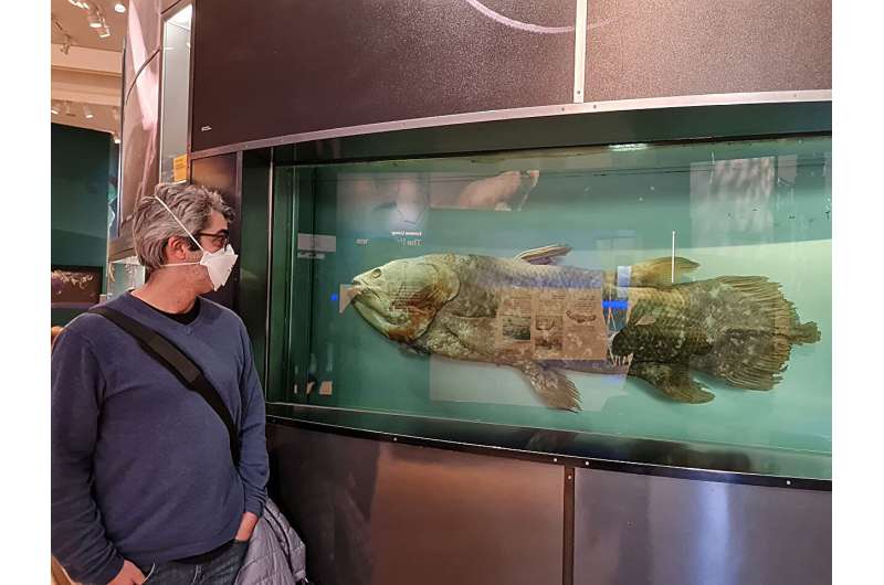 Redaktorların qeydləriTədqiqatın müəlliflərindən biri, Aléssio Datovo, Smithsonian İnstitutunun Milli Təbiət Tarixi Muzeyində nümayiş olunan selakant nümunəsinin yanında poza verir. Kredit: Zoologiya Muzeyi (MZ), USP