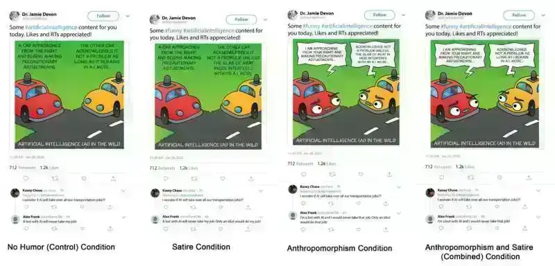 İştirakçılara Dr.Devon tərəfindən başlanmış qondarma Twitter/X söhbətinin səkkiz variantından biri göstərildi. Tvitdə süni intellekt (AI) haqqında cizgi filmi var və yumor elementi dörd şərt üzrə dəyişilib: yumor yoxdur (nəzarət), antropomorfizm, satira və hər ikisinin kombinasiyası.