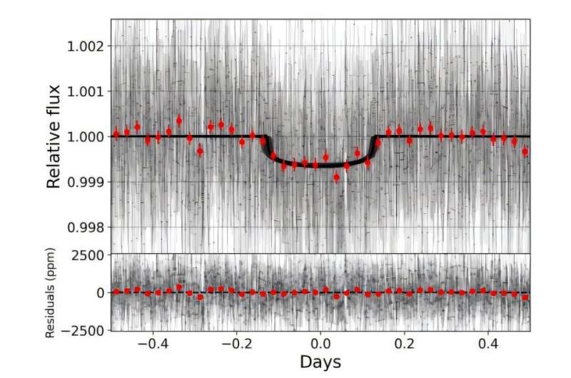 Redaktorların qeydləriTOI-1422 c-nin mərhələli TESS keçidləri (üst panel) və RV siqnalı (alt panel), ən yaxşı quraşdırılmış modellər, qara rəngdə və onların qalıqları hər panelin altındadır. Qırmızı dairələr müvafiq olaraq ortalama ~31 dəqiqə və ~83 saatı, boz sahələr isə hər modeldən 1𝜎 kənarlaşmanı təmsil edir. Kredit: arXiv (2025). DOI: 10.48550/arxiv.2511.11492