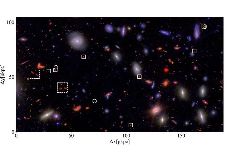 Redaktorların qeydləriF090W, F277W və F444W filtrlərindən istifadə edərək, spektroskopik olaraq təsdiqlənmiş qalaktikaların (kvadratlar, bərk xətt) və fotometrik namizədlərin (dairələr) mövqelərini göstərən üst-üstə düşmüş nöqtələrlə A2744-z7p9OD-un RGB şəkli. Kəsik, böyük kvadratlar ən çox toplanmış əsas bölgələri göstərir. Kredit: arXiv (2025). DOI: 10.48550/arxiv.2507.06284