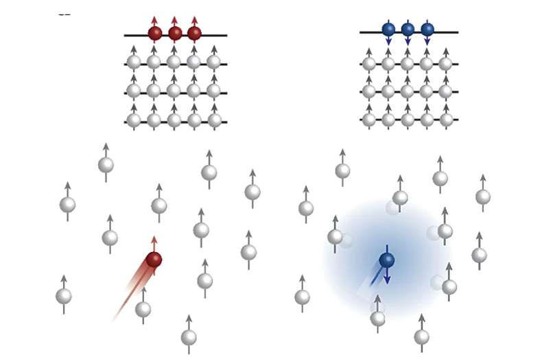 Redaktorların qeydləriSolda: spin-əksəriyyətli mobil operatorlar doldurulmuş Landau səviyyələrində hərəkətsiz eyni fırlanmalı yük fonundan keçə bilər. Sağda: Fermi səviyyələrində spin-azlıq daşıyıcıları, doldurulmuş Landau səviyyələrində əks fırlanma yükləri ilə qarşılıqlı təsirlərə görə lokallaşdırılır. Kredit: Shih et al
