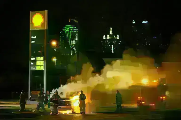 UC Riverside mühəndisləri təsadüfi yanğın risklərini aradan qaldıraraq təhlükəsizliyi artıraraq yalnız elektrik cərəyanı vasitəsilə alovlanan unikal maye yanacaq yaratdılar. Dəyişdirilmiş ion mayesinə əsaslanan bu innovativ yanacaq idarə olunan yanmağa imkan verir və əlavə tədqiqat və xərclərə dair mülahizələrə ehtiyac olsa da, avtomobilin təhlükəsizliyini potensial olaraq dəyişdirə bilər. Yanğınsöndürənlər yanacaqdoldurma məntəqəsində alovu söndürür. Kredit: Thomas Hawk